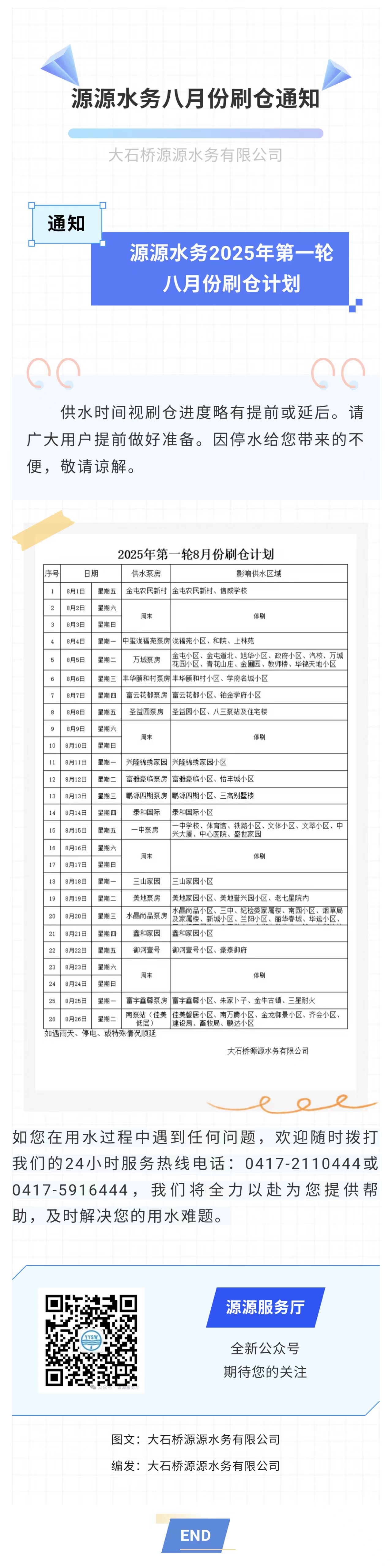 公司新聞 您當(dāng)前的位置: 大石橋源源水務(wù)有限公司 >資訊動態(tài) >公司新聞 源源水務(wù)八月份刷倉通知 作者: 2021-03-30 下一篇:關(guān)于冬季防寒防凍的溫馨提示 下一篇:源源水務(wù)九月份刷倉通知 返回